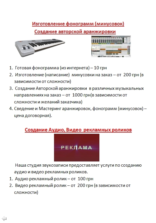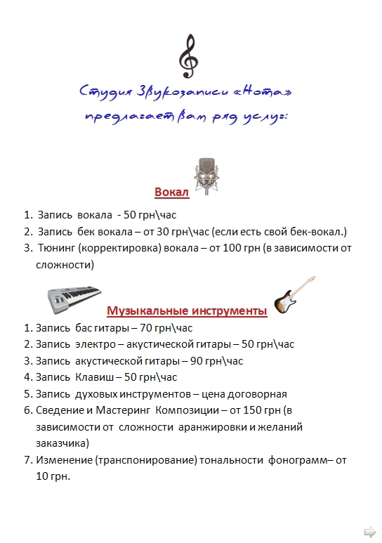 Услуги и цены нашей студии звукозаписи "Нота"